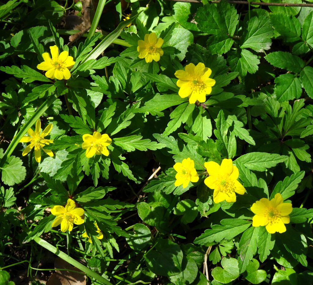 Im Halbschatten ist das Scharbockskraut zu sehen. Die gelben Blüten erscheinen ab Ende Februar und bieten vielen Insekten die erste Nahversorgung nach der kalten Jahreszeit. Nach der Blüte bilden die Pflanzen ein giftiges Alkaloid.